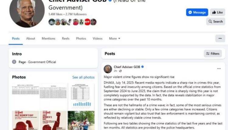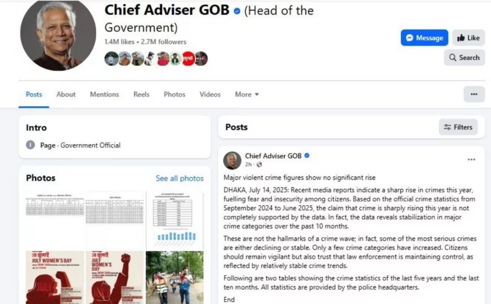 প্রধান ‍উপদেষ্টার ফেসবুক পেজে সোমবার (১৪ জুলাই) দুপুরে দেওয়া এক পোস্টে এ তথ্য জানানো হয়েছে। পোস্টে বলা হয়েছে, দেশে বড় অপরাধের প্রবণতা নিয়ন্ত্রণে রয়েছে এবং আইন-শৃঙ্খলা বাহিনী পরিস্থিতি দৃঢ়ভাবে মোকাবেলা করছে।