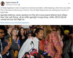 যুক্তরাষ্ট্রের টেনেসিতে দুজন কৃষ্ণাঙ্গ নেতাকে রাজ্যের আইনসভা থেকে বহিষ্কারের ঘটনাটি দেখিয়ে শনিবার নিজের ফেরিভায়েড ফেসবুকে দেওয়া এক পোস্টে এমন মন্তব্য করেন জয়।
