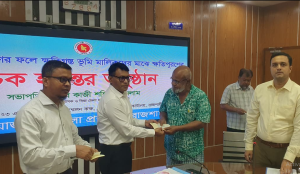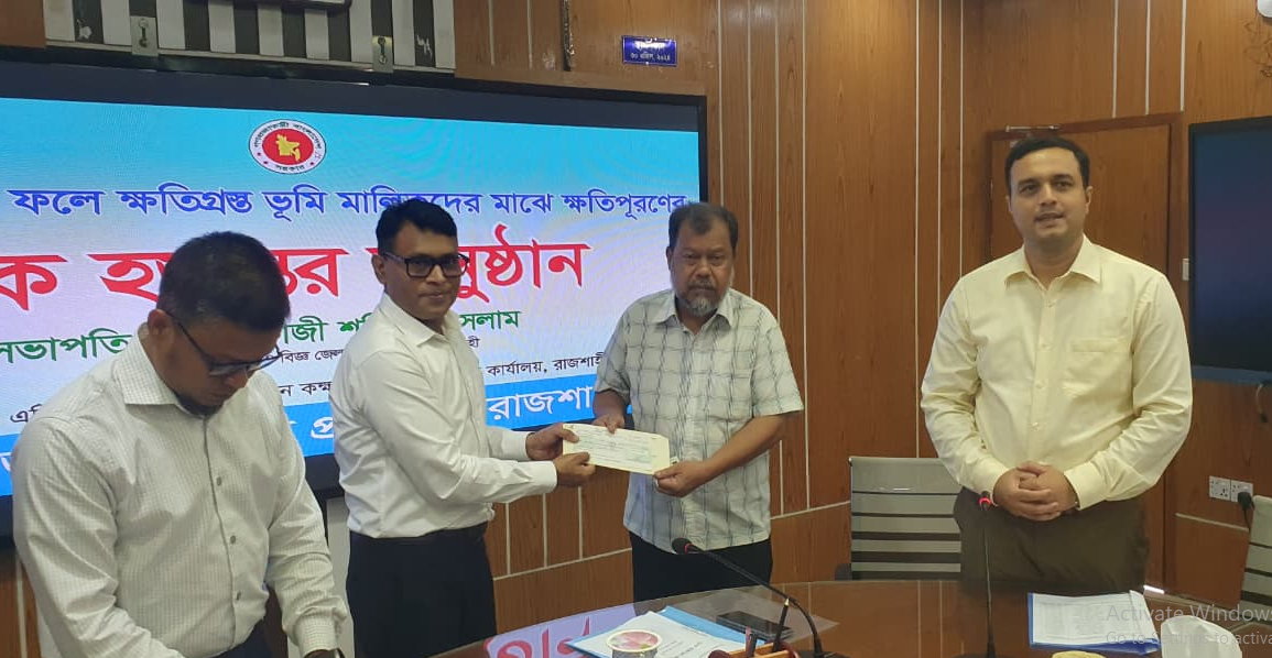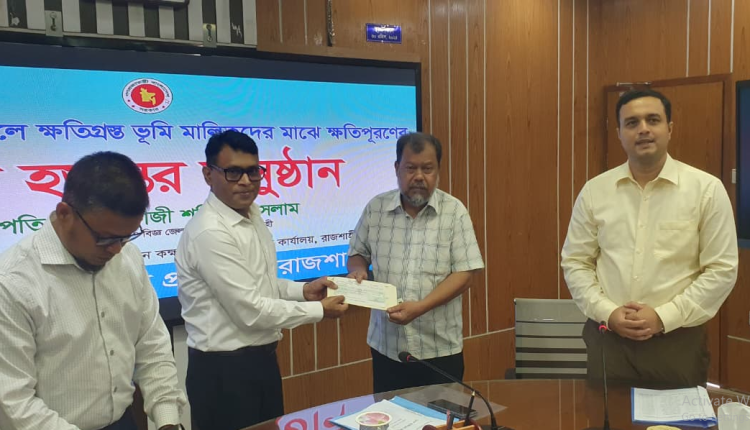 রাজশাহী: ক্ষতিগ্রস্ত ভূমি মালিকদের মাঝে চেক বিতরণ